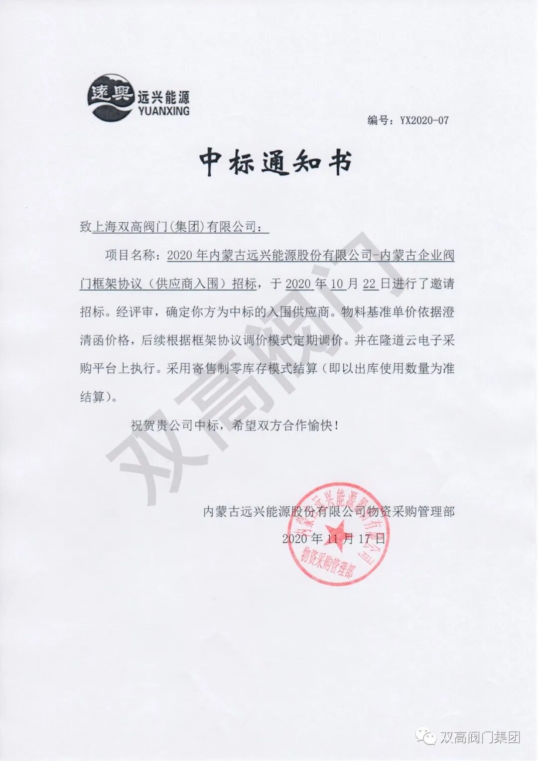 2020年11月17日,双高阀门集团成功中标2020年内蒙古远兴能源股份有限公司-内蒙古企业、河南企业阀门框架协议(供应商入围)招标项目。